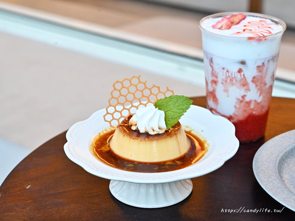 Sundate cafe的烤布丁是使用沖繩本和香糖製作,口感綿密帶濃郁的焦糖香氣,搭配鮮奶油,微甜不膩