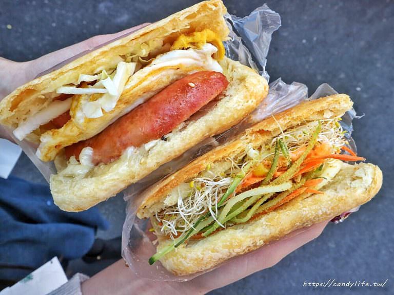 另外這個香腸蛋燒餅是假日限定販售,平日來可是買不到的,第一次看到燒餅裡頭夾香腸,還蠻特別的,裡頭除了香腸、還有荷包蛋及生菜,搭配厚實又酥脆的燒餅,一樣餡料滿滿,不過香腸的部分糖糖覺得稍微肥了點,吃多了會有點膩口