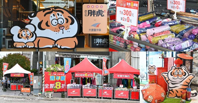 大振豐洋傘5週年慶特賣會開跑啦!全年最優惠就等一波,全館下殺8折起,室外花車更優惠,限時搶購一支300元,第二支0元,還有原價一支1024元,特價三支1000元,這麼划算還不趕緊衝一波,1/7-1/16限時10天,晚一步只能等明年啦~這次大振豐洋傘應景虎年,首度與不二馬大叔的我不是胖虎聯名,推出多款胖虎聯名商品,現在還有可愛胖虎打卡牆唷