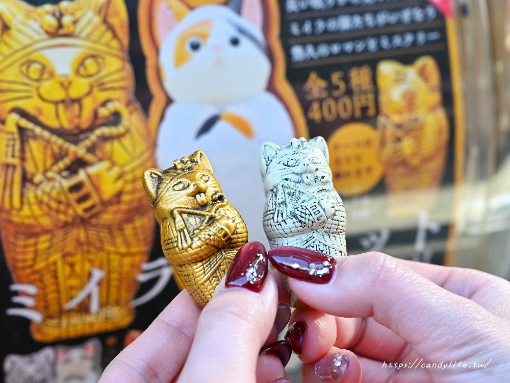 如果你也是貓奴或者是扭蛋控,真的很推薦去樂成宮求姻緣、拜媽祖時,順便繞到旁邊的「樂成燒」門口試試手氣。 木乃伊貓貓扭蛋不僅外殼可以當成精緻的木乃伊棺木擺飾,裡頭的小貓公仔更是軟萌到不行,這種反差感真的會讓人想五款全部收集齊全!