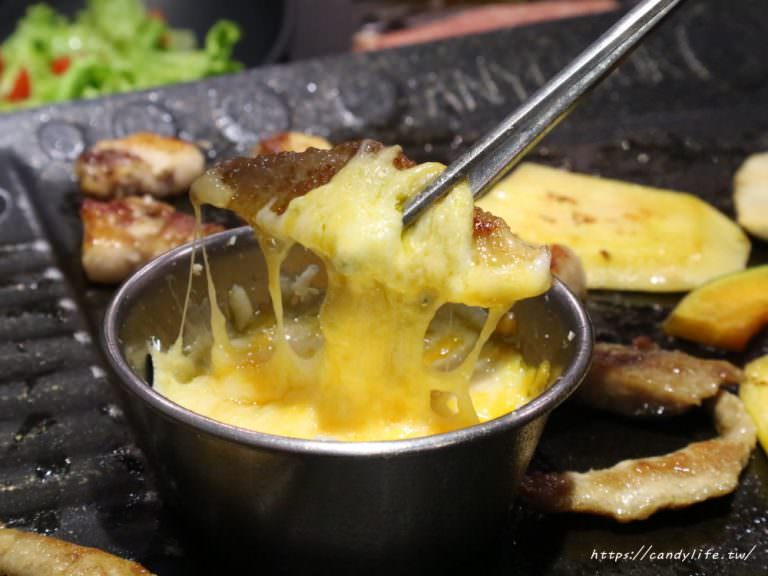 還記得糖糖剛剛用飯換的起司嗎,來來來,直接放在火板上加熱後就可以搭著肉片一起享用囉,瞧瞧這畫面真的有夠邪惡,糖糖已經完全把熱量這件事拋到後腦勺去了