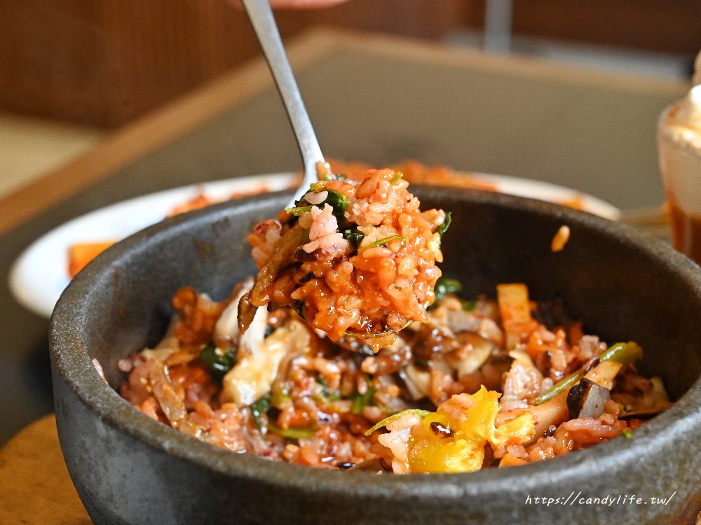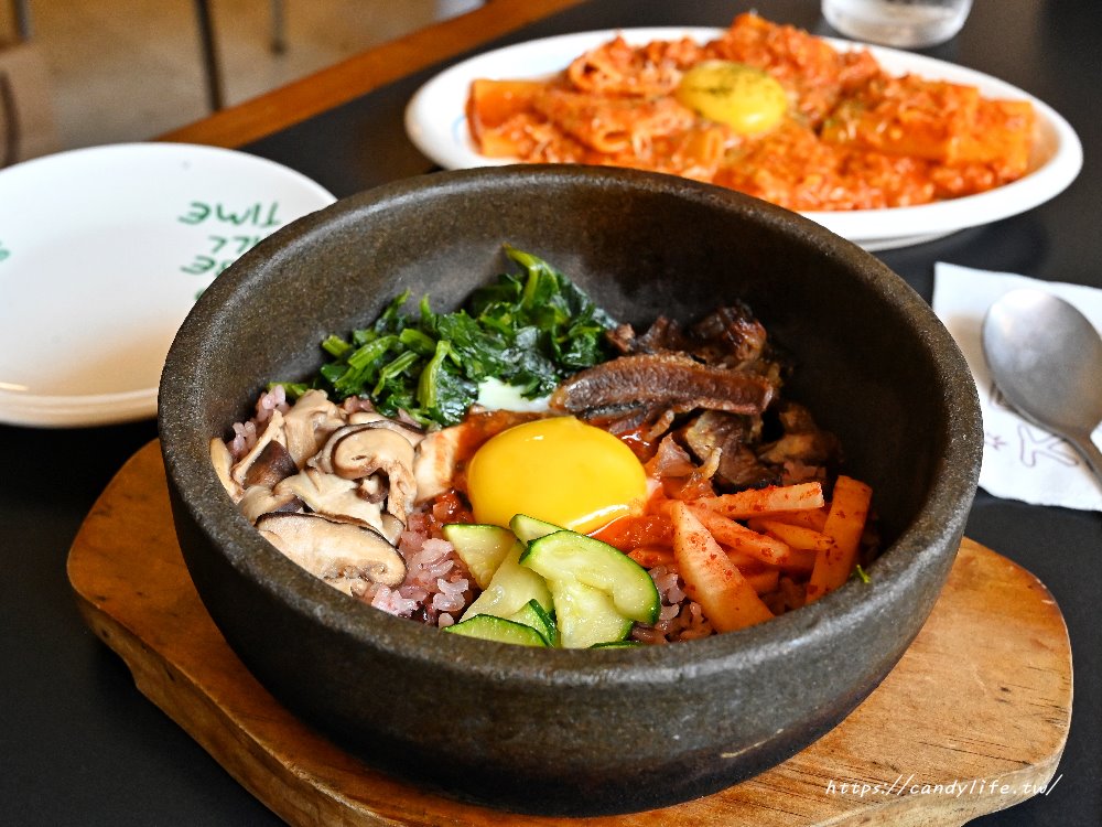 石鍋拌飯上桌時還會吱吱作響,建議一上桌就趕快拌,不然底下米飯容易焦掉!這裡的石鍋拌飯是採用Q彈的紫米飯,上頭擺上炒香菇、青菜、醃製蘿蔔、小黃瓜與牛頰肉,中間打上一顆生蛋黃