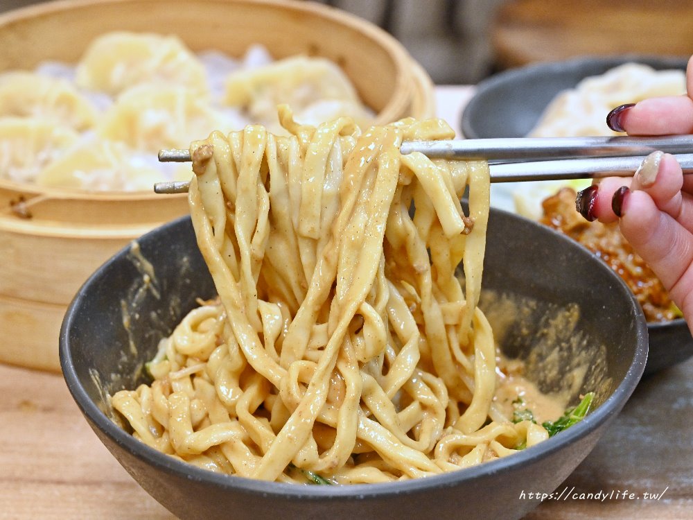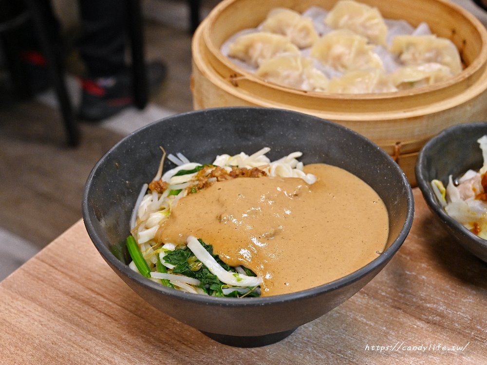除了蒸餃之外,這碗麻醬麵也是人氣必點!一上桌,那層給得毫不手軟、極致濃稠的麻醬幾乎覆蓋了整碗麵,質地濃郁到像是芝麻糊一般,店家特別選用Q彈的寬扁麵,這種麵體最大的優點就是抓醬力極強,趁熱將醬汁與麵條攪拌均勻時,爆炸性的芝麻香氣會隨著蒸氣撲鼻而來
